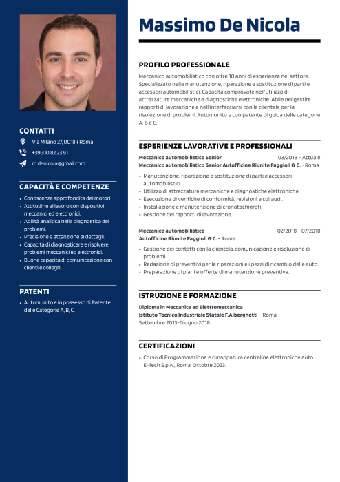 Meccanico automobilistico con oltre 10 anni di esperienza nel settore. Specializzato nella manutenzione, riparazione e sostituzione di parti e accessori automobilistici. Capacità comprovate nell'utilizzo di attrezzature meccaniche e diagnostiche elettroniche. Abile nel gestire rapporti di lavorazione e nell'interfacciarsi con la clientela per la risoluzione di problemi. Automunito e con patente di guida delle categorie A, B e C.