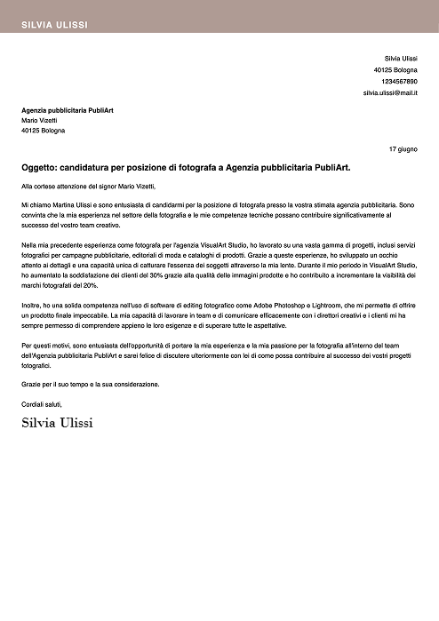 Per questi motivi, sono entusiasta dell'opportunità di portare la mia esperienza e la mia passione per la fotografia all’interno del team dell'Agenzia pubblicitaria PubliArt e sarei felice di discutere ulteriormente con lei di come possa contribuire al successo dei vostri progetti fotografici.