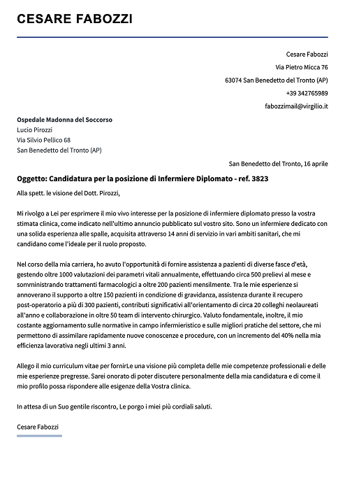 Mi rivolgo a Lei per esprimere il mio vivo interesse per la posizione di infermiere diplomato presso la vostra stimata clinica, come indicato nell'ultimo annuncio pubblicato sul vostro sito. Sono un infermiere dedicato con una solida esperienza alle spalle, acquisita attraverso 14 anni di servizio in vari ambiti sanitari, che mi candidano come l'ideale per il ruolo proposto.