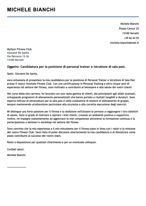 Allego il mio curriculum vitae, nel quale troverà una descrizione dettagliata delle mie competenze e delle mie esperienze lavorative precedenti. Spero di poter presto mostrare di persona le nuove schede di allenamento che ho preparato per aumentare la massa muscolare.