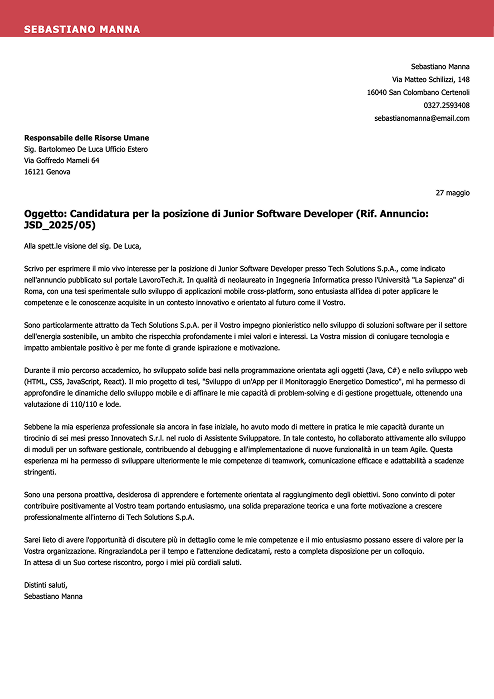 Sono particolarmente attratto dalla cultura innovativa e dalla reputazione di eccellenza tecnologica di CrackCode S.p.A. Sono convinto che le mie competenze tecniche, unite alla mia capacità di lavorare in team e alla mia propensione per l'apprendimento continuo, mi rendano un candidato ideale per questa posizione.
