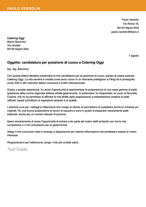 Con questa lettera desidero presentare la mia candidatura per la posizione di cuoco, presso la vostra azienda Catering Oggi. La mia carriera è iniziata come aiuto cuoco in un ristorante prestigioso a Parigi ed è proseguita come chef in altri ristoranti italiani conosciuti a livello internazionale.