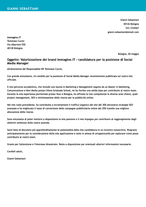 Con grande entusiasmo, mi candido per la posizione di Social Media Manager recentemente pubblicata sul vostro sito ufficiale.